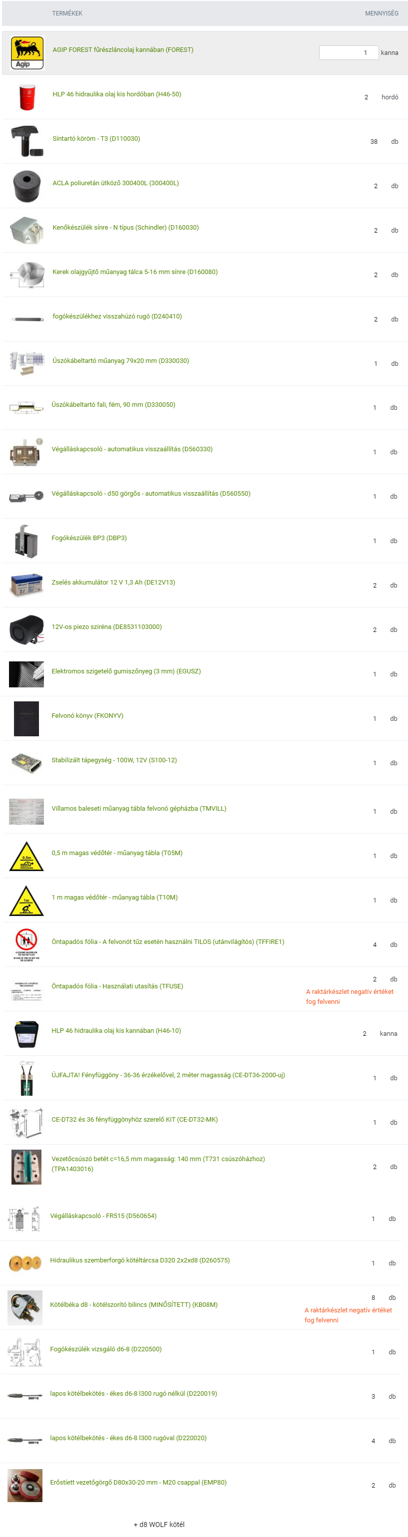 He: 6000 mm, Q: 375 kg / 5 személy, P: 585 kg, szintek/kijáratok: 3 / 3 (egyoldali), Vn: 0,38 m/s, fülke: 800 x 1250 x 2100 mm, ajtó: 700 x 2000 mm 2 részes, teleszkópos RAL 7032, E0 tűzállóság, jobbos, fülkeajtón mechanikus retesz, vezérlés: ECUMega legyűjtős, ECOM modul nélkül